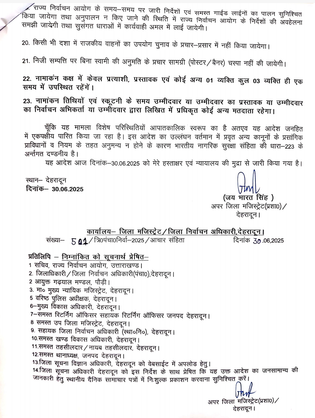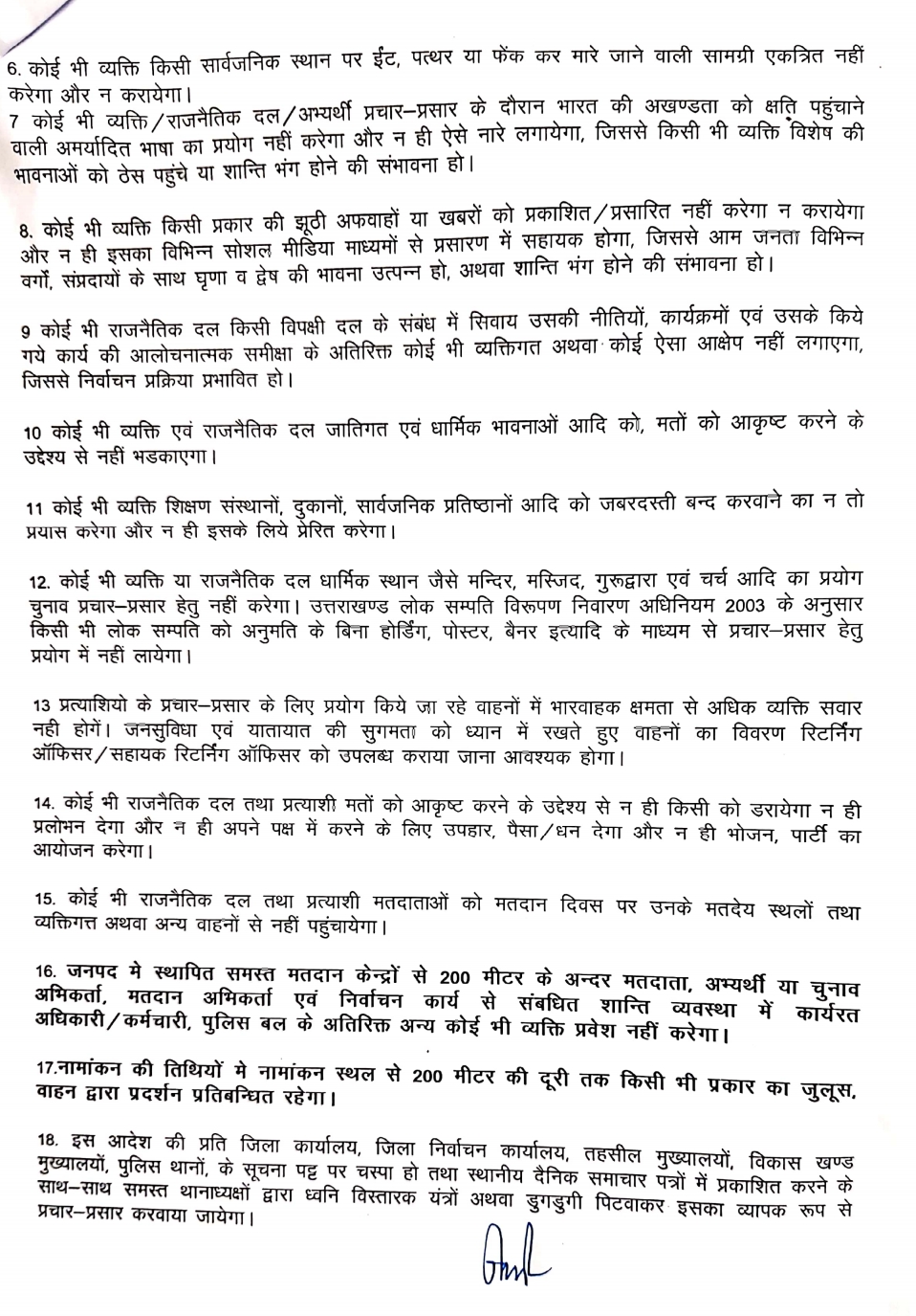 त्रिस्तरीय पंचायत क्षेत्रान्तर्गत सार्वजनिक स्थलों पर बिना आरओ की अनुमति के कोई बैठक, सभा नही होगी। कोई भी 05 से अधिक व्यक्तियों का समूह नही बनाएगा। परगना मजिस्ट्रेट की अनुमति के बैगर रोड़ शो, जुलूस, जनसभा, रैली आयोजित नही की जाएगी। विद्यालयों, न्यायालयों, चिकित्सालयों तथा धार्मिक स्थलों के समीप ध्वनि विस्तारक यंत्रों का प्रयोग नही किया जाएगा। झूठी खबरों को प्रचारित प्रसारित नही किया जाएगा। कोई भी व्यक्ति एवं राजनीतिक दल जातिगत एवं धार्मिक भावनाओं को नही भडकाएगा। धार्मिक स्थलों का प्रयोग चुनाव प्रचार के लिए नही किया जाएगा। कोई भी राजनीतिक दल या प्रत्याशी मतदाताओं को डरा, धमका कर या प्रलोभन देने का प्रयास नही करेगा। मतदाताओं को वाहनों से पहुंचाने का काम नही करेगा। जनपद में स्थित समस्त मतदान केंद्रों से 200 मीटर के अंदर मतदाता, अभ्यर्थी या चुनाव अभिकर्ता, मतदान अभिकर्ता एवं निर्वाचन कार्य से संबंधित शान्ति व्यवस्था में कार्यरत अधिकारी, कर्मचारी, पुलिस बल के अतिरिक्त अन्य कोई भी व्यक्ति प्रवेश नही करेगा। नामांकन तिथियों से नामांकन स्थल से 200 मीटर की दूरी तक किसी भी प्रकार का जुलूस, वाहन द्वारा प्रदर्शन प्रतिबंधित रहेगा। राजकीय वाहनों का प्रयोग चुनाव प्रचार के लिए नही किया जाएगा। यह आदेश जनहित में एक पक्षीय पारित किया जा रहा है। आदेश का उल्लंघन भारतीय नागरिक सुरक्षा संहिता की धारा-223 के अधीन दंडनीय होगा।