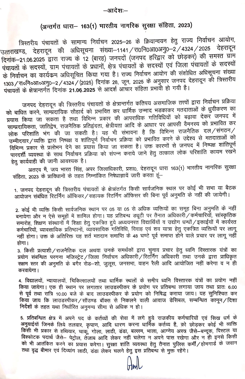 देहरादून – त्रिस्तरीय पंचायतों के सामान्य निर्वाचन-2025-26 को शांतिपूर्ण संपन्न कराने हेतु निर्वाचन क्षेत्रान्तर्गत धारा-163 लागू कर दी गई है। अपर जिला मजिस्ट्रेट जय भारत सिंह ने इसके आदेश जारी किए है। अपर जिला मजिस्ट्रेट ने बताया कि त्रिस्तरीय पंचायत क्षेत्रान्तर्गत कतिपय असामाजिक तत्वों द्वारा निर्वाचन प्रक्रिया को बाधित करने, साम्प्रदायिक सौहार्द को प्रभावित कर धार्मिक उन्माद भड़का कर मतदाताओं के ध्रुवीकरण का प्रयास किया जा सकता है। यह भी संभावना है कि विभिन्न राजनीतिक दल, संगठन, उम्मीदवार, व्यक्ति द्वारा निष्पक्ष व शांतिपूर्ण निर्वाचन प्रक्रिया को प्रभावित करने के उद्देश्य से मतदाताओं को प्रलोभन देने का प्रयास किया जा सकता है। इसके देखते हुए अपर जिला मजिस्ट्रेट ने निषेधाज्ञाएं जारी कर दी है।