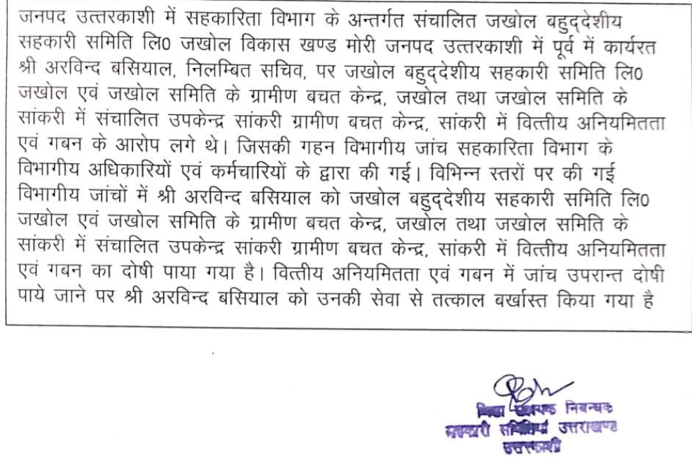 उत्तराखंड सहकारी समिति के सचिवअरविन्द बसियाल को तत्काल किया गया बर्खास्त December 11, 2025December 11, 2025 Rakesh Raturi 33 Views मोरी – जनपद उत्तरकाशी के तहसील मोरी के अंतर्गत संचालित बहुउद्देश्यीय सहकारी समिति के सचिव अरविन्द बसियाल पर लगे अनिमितताओं व गबन के आरोप सिद्ध होने पर उन्हें तत्काल प्रभाव से बर्खास्त कर दिया गया है।