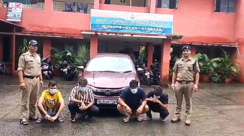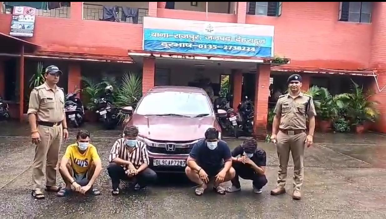 देहरादून – स्थानीय व्यक्तियों द्वारा दूरभाष के माध्यम से थाना राजपुर पर सूचना दी कि कुठालगेट राजपुर रोड पर वाहन संख्या: डीएल-09-सीएपी-7287 के चालक द्वारा खतरनाक ढंग से गाडी चलाते हुए अपनी तथा आने जाने वाले अन्य लोगों की जान को खतरे में डाला जा रहा है। साथ ही कार में सवार युवक कार की खिडकियों से बाहर लटके हुए तथा शोर शराबा करते हुए हुडदंग मचा रहे हैं। सूचना पर थाना राजपुर पुलिस द्वारा तत्काल सघन चैकिंग अभियान चलाते हुए कुठालगेट के पास ही कार को रोक कर चैक किया गया तो पाया कि कार के चालक दिशांत पवार पुत्र श्री प्रेमपाल पवार निवासी मुनिरका साउथ वेस्ट दिल्ली द्वारा शराब के नशे में गाडी चलाई रही थी तथा कार में सवार अन्य युवक सन्नी पंवार पुत्र धर्मेन्द्र निवासी शाहपुरजट दिल्ली, पंकज कुमार पुत्र सतेन्द्र सिंह निवासी जँहागीरपुर दिल्ली तथा अनिकेत पुत्र संजय निवासी मोलरबंद एक्सटेंशन बदरपुर बॉर्डर दिल्ली द्वारा वाहन की खिड़की से शरीर बाहर निकालकर शहर मे हुड़दंग मचाया जा रहा था। जिस पर पुलिस द्वारा कार चालक को मौके गिरफ्तार करते हुए वाहन को एम0वी0 एक्ट में सीज किया गया तथा वाहन की खिडकियों में बैठकर हुडदंग कर रहे अन्य अभियुक्तों के विरूद्ध पुलिस एक्ट के तहत वैधानिक कार्यवाही की जा रही है।