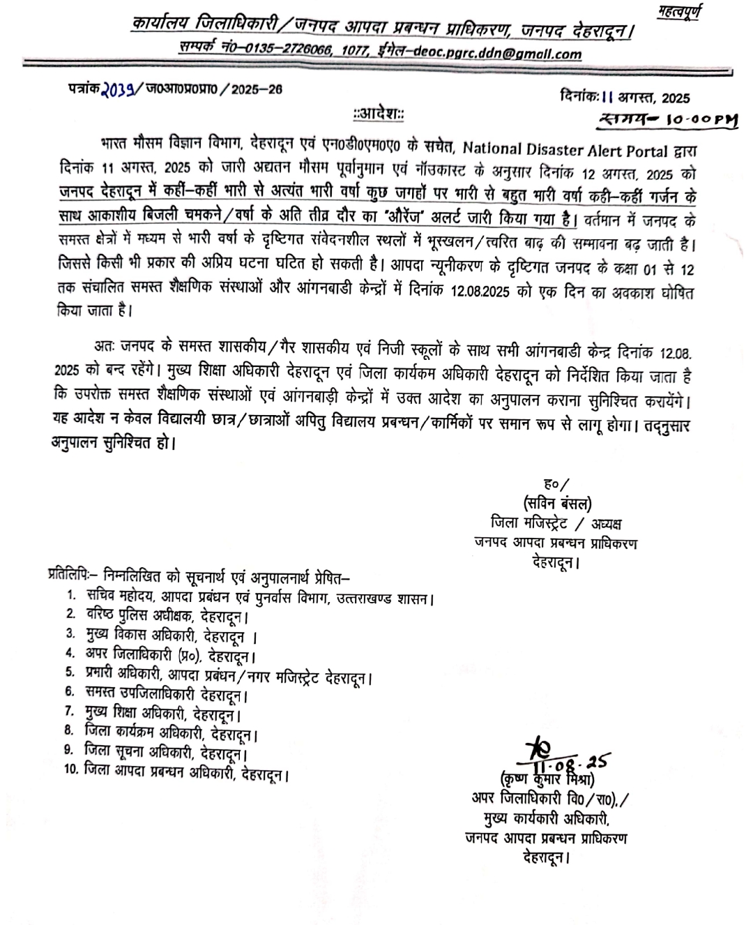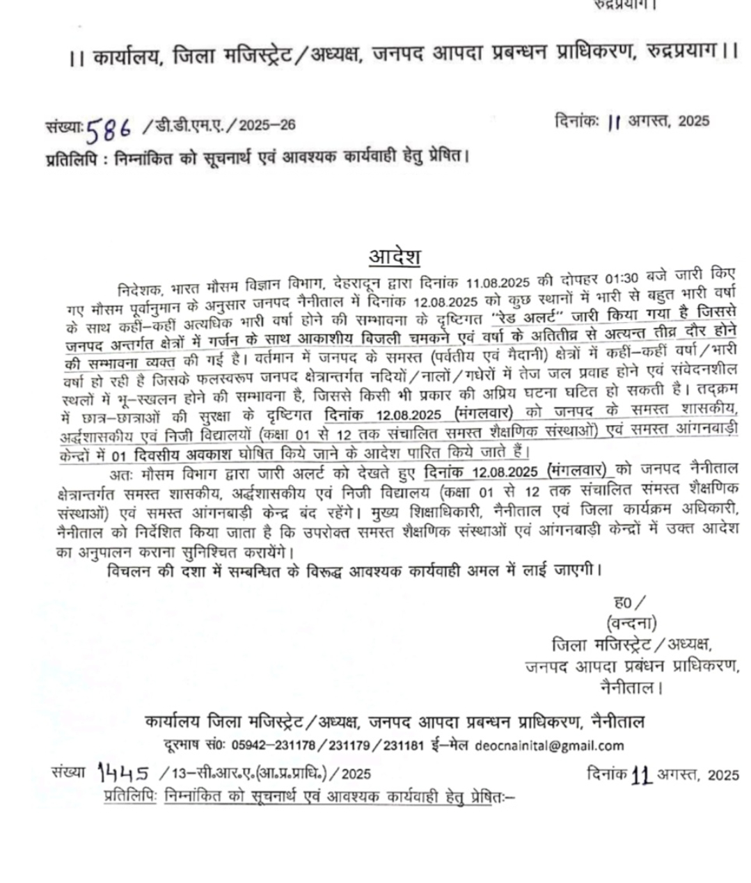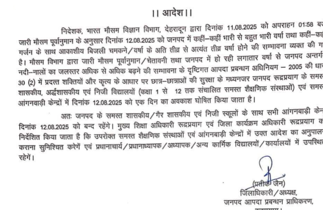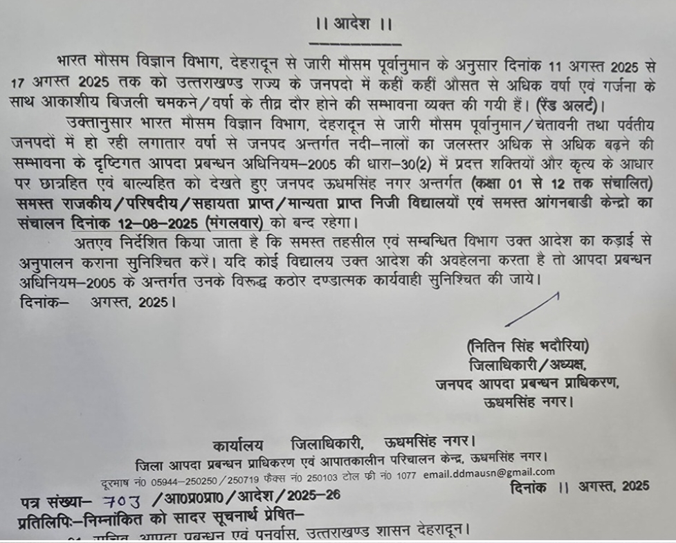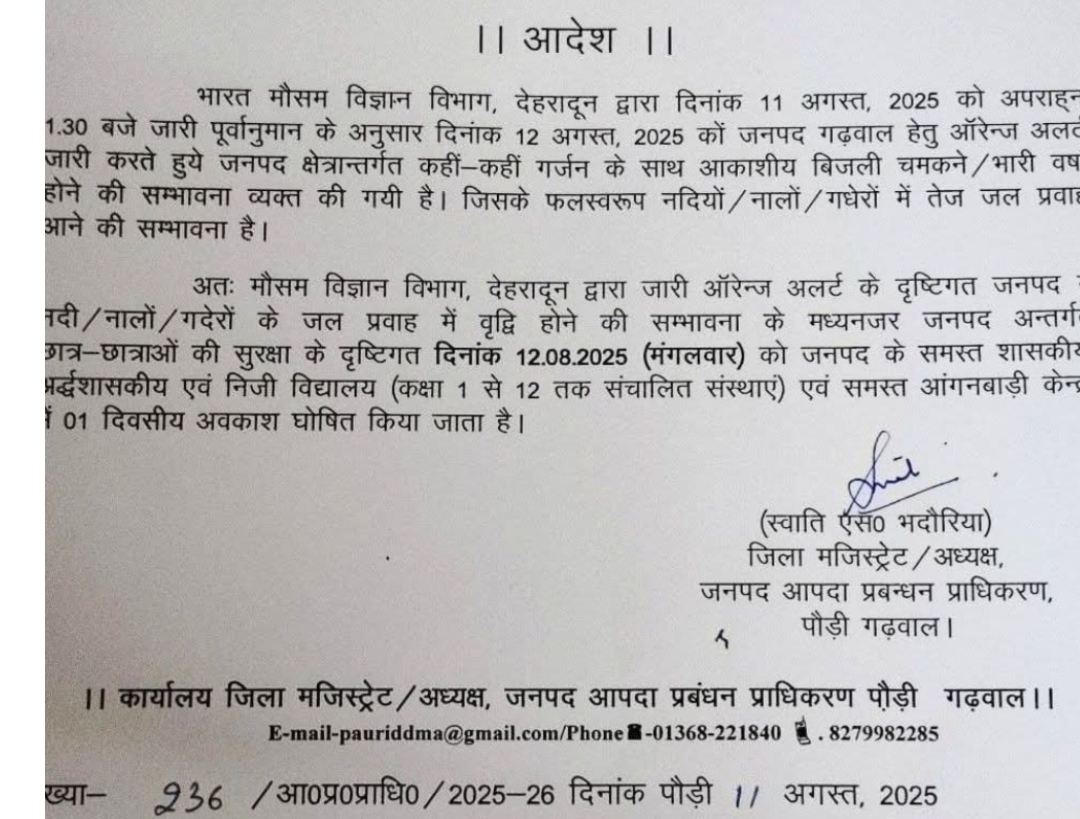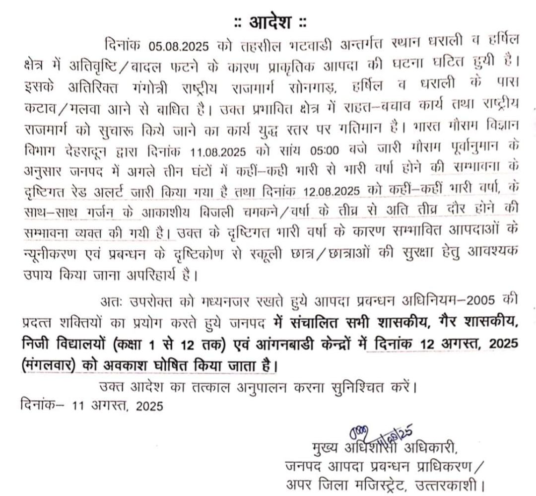 उत्तराखंड उत्तराखंड में भारी बारिश की सम्भावना के कारण कई जनपदों में स्कूलों की आज रहेगी छुट्टी August 12, 2025 Rakesh Raturi 50 Views देहरादून – उत्तराखंड में लगातार बारिश के कारण जनजीवन अस्त व्यस्त हो गया है चारों तरफ पानी ही पानी नजर आ रहा है ,मौसम विभाग ने आज अलर्ट जारी किया है जिसके कारण कई जनपदों में आज स्कूलों में छुट्टी का आदेश जारी कर दिया गया है-