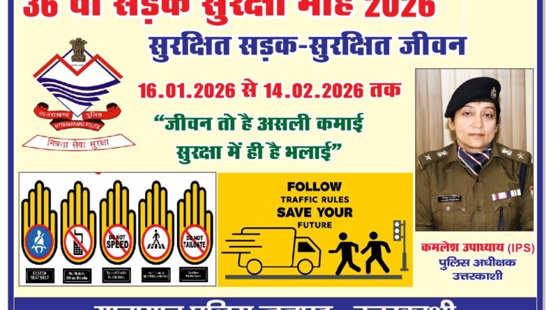 उत्तरकाशी – यातायात नियमों तथा सडक सुरक्षा के प्रति जागरुकता बढ़ाने के उद्देश्य से पुलिस अधीक्षक उत्तरकाशी कमलेश उपाध्याय के निर्देशन में यातायात पुलिस उत्तरकाशी द्वारा 16 जनवरी-14 फरवरी 2026 तक “36वां सड़क सुरक्षा माह” आयोजित किया जा रहा है। सड़क सुरक्षा माह 2026 के अंतर्गत यातायात पुलिस उत्तरकाशी की टीम द्वारा रामलीला मैदान उत्तरकाशी में चल रहे माघ मेला(बाडाहाट कू थौलू) में सडक सुरक्षा, जीवन रक्षा की प्रदर्शनी लगाकर मेलार्थियों, वाहन चालकों व राहगीरों को यातायात नियमों शराब पीकर वाहन न चलाने, ओवर लोडिंग न करने, बिना हेलमेट दोपहिया वाहन न चलाने, ओवरस्पीड, तीन सवारी, आदि के सम्बन्ध में जानकारी देते हुये जागरुक तथा गुड सेमेरिटन की जानकारी देते हुये सड़क दुर्घटना के दौरान घायलों की मदद हेतु प्रेरित किया रहा है। याताायात की टीम द्वारा लोगों को सड़क सुरक्षा सम्बन्धी पम्पलेट भी वितरित किर यातायात नियमों की महत्ता समझायी जा रही है। वाहनों पर रिफ्लेक्टर टेप चिपकाकर सडक सुरक्षा के लिये प्रेरित किया जा रहा है।