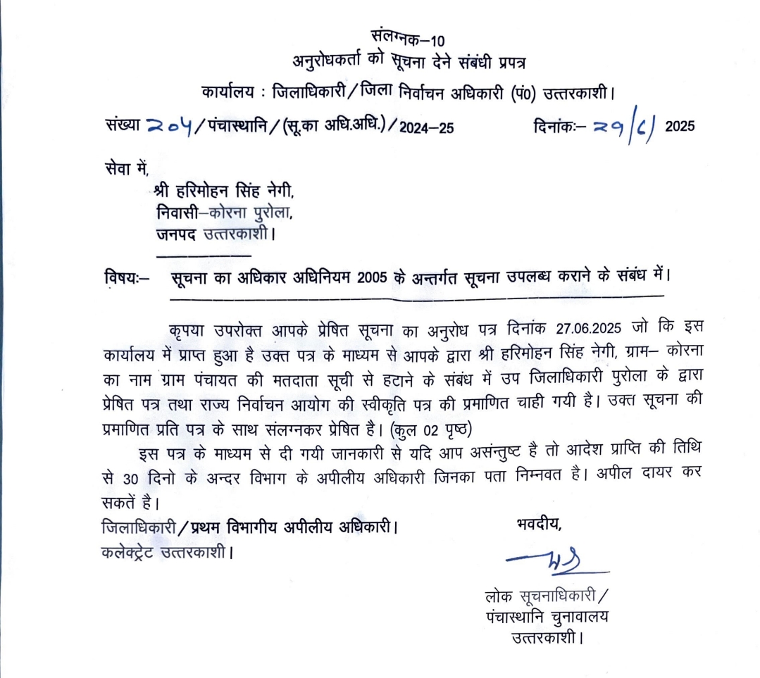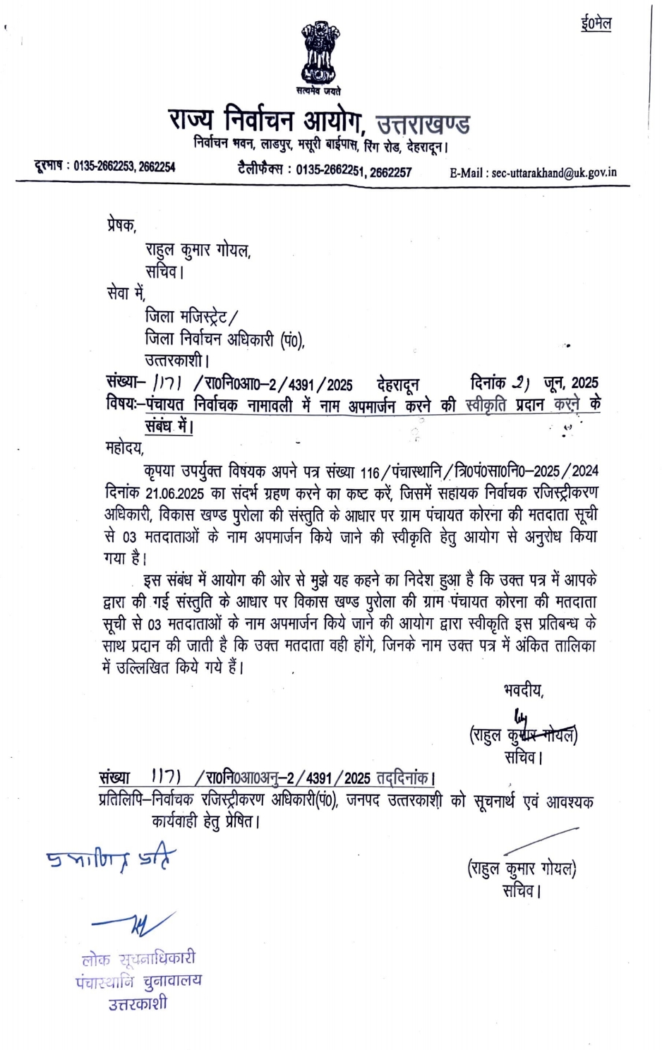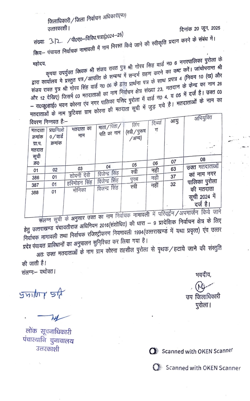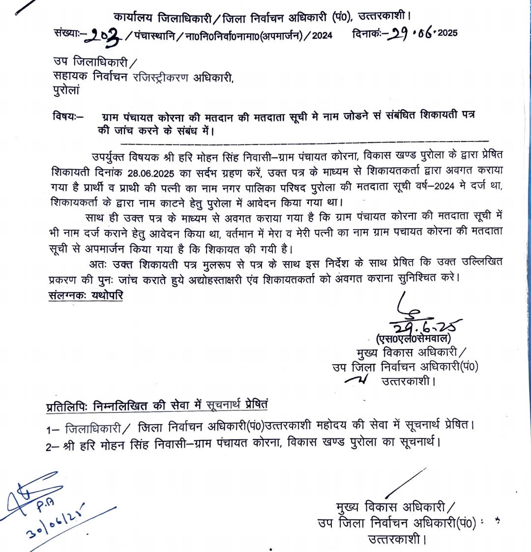 पुरोला – पुरोला नगर पालिका के पूर्व अध्यक्ष हरिमोहन नेगी षड्यंत्रकारी लोगों के कारण अपने गांव से निर्वाचन सूची से बाहर हो गए ,पुरोला विकास खण्ड के अंतर्गत कोरना गांव के रहने वाले पूर्व नगर पालिका अध्यक्ष हरिमोहन ने अपना नाम पुरोला से हटा कर अपने गांव में जोड़ने के लिए आवेदन किया था।उनका नाम मतदाता सूची में भी चढ़ गया।हरिमोहन जिला पंचायत सदस्य सीट के लिए चुनाव लड़ना चाह रहे थे लेकिन प्रतिद्वंद्वी को अपनी सीट खिसकती नजर आ रही थी।ऐसा षड़यंत्र रचा की उसका नाम ही हटवा दिया।हरिमोहन को जव मालूम चला तो उसने निर्वाचन आयोग से शिकायत की लेकिन सत्ता के अधिकारियों ने कुछ नहीं सुनी।हरिमोहन ने सोशियल मीडिया में अपनी एक पोस्ट साझा की-