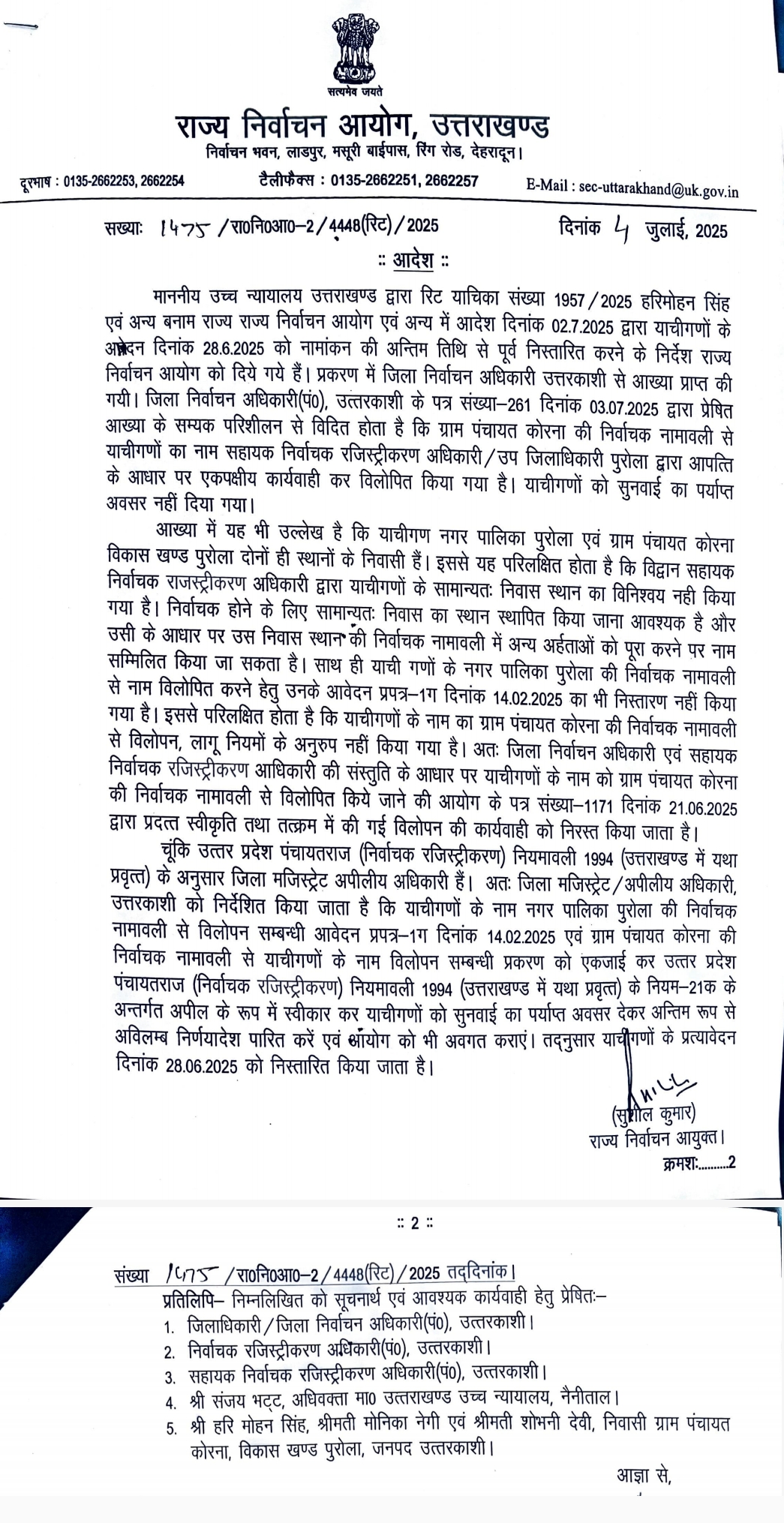 पुरोला – हाई कोर्ट ने निर्वाचन आयोग को आदेशित करते हुए निर्वाचन आयोग को कहा कि हरिमोहन का नाम अपने गांव कोरना मतदाता सूची में ही शामिल किया जाय।हरिमोहन को चुनाव में बाहर करने के लिए प्रतिद्वंदियों ने पूरा जोर लगाया लेकिन हाईकोर्टबने सबको नकार दिया।