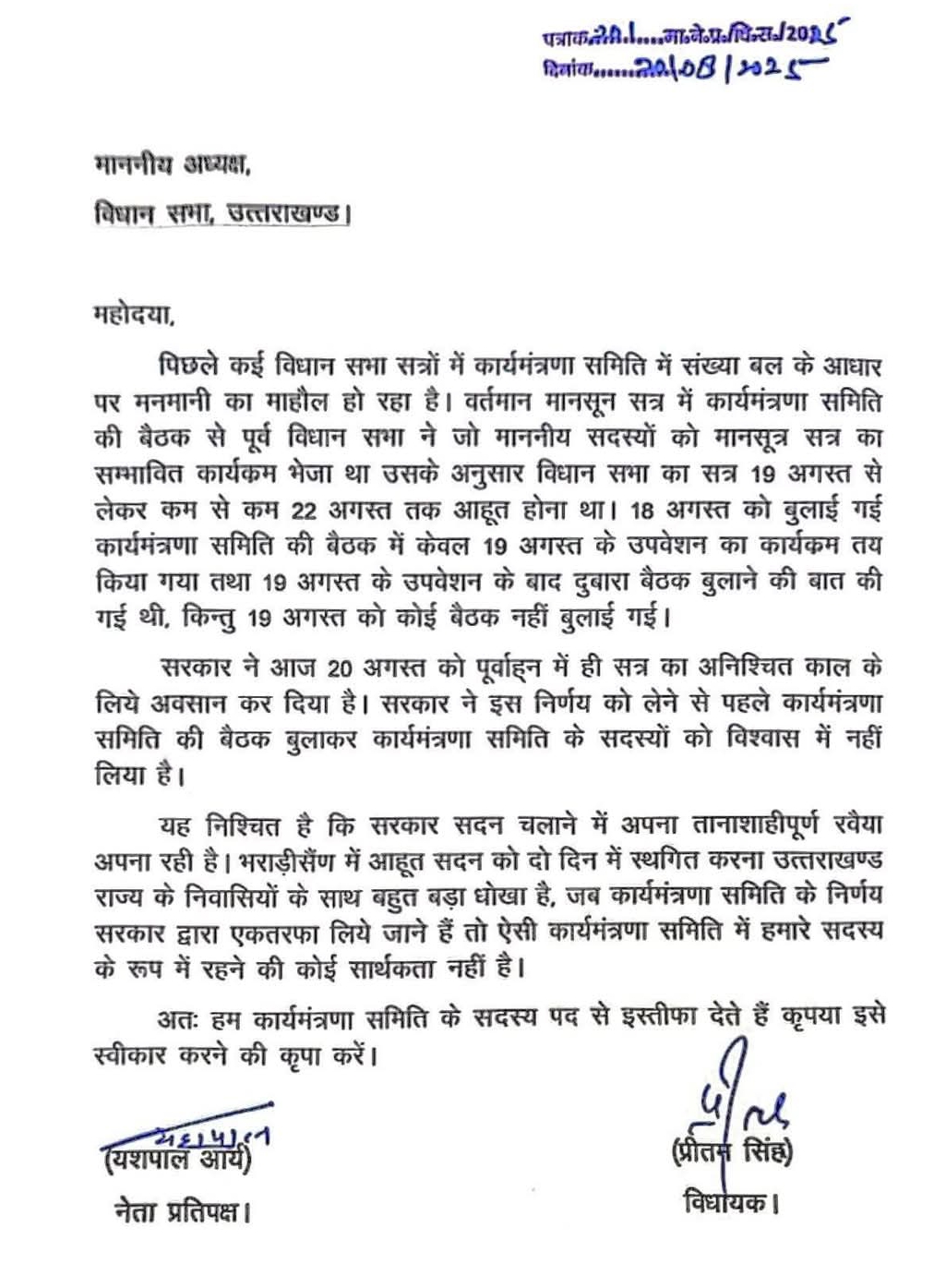 नेता प्रतिपक्ष यशपाल आर्य और चकराता के विधायक प्रीतम सिंह ने विधानसभा की कार्यमंत्रणा समिति से दिया इस्तीफा