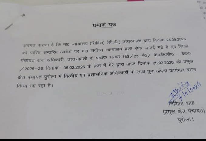 प्रधानों/क्षेत्र पंचायत सदस्यों ने प्रमुख के वित्तीय अधिकार बहाल होने पर खुशी जताई है। उन्होंने कहा कि पिछले 6 माह से विकास कार्य ठप पड़े थे। जिसे अब गति मिलने की उम्मीद जगी है। वित्तीय अधिकार बहाल होने की घोषणा विकास खंड अधिकारी पुरोला सुरेश चौहान ने की। इस दौरान पूर्व विधायक मालचंद, कविंद्र असवाल, चमन प्रकाश नौडियाल, पूरण सिंह राणा प्रमुख पति अंकित शाह, मोहित शाह सहित प्रधान/क्षेत्र पंचायत ओर समर्थक रहे।
