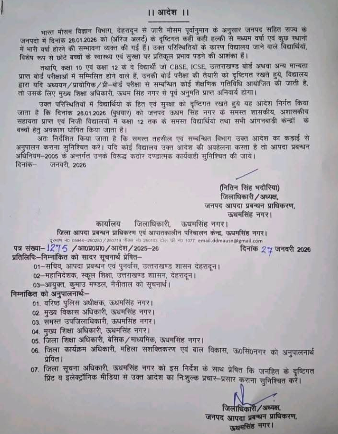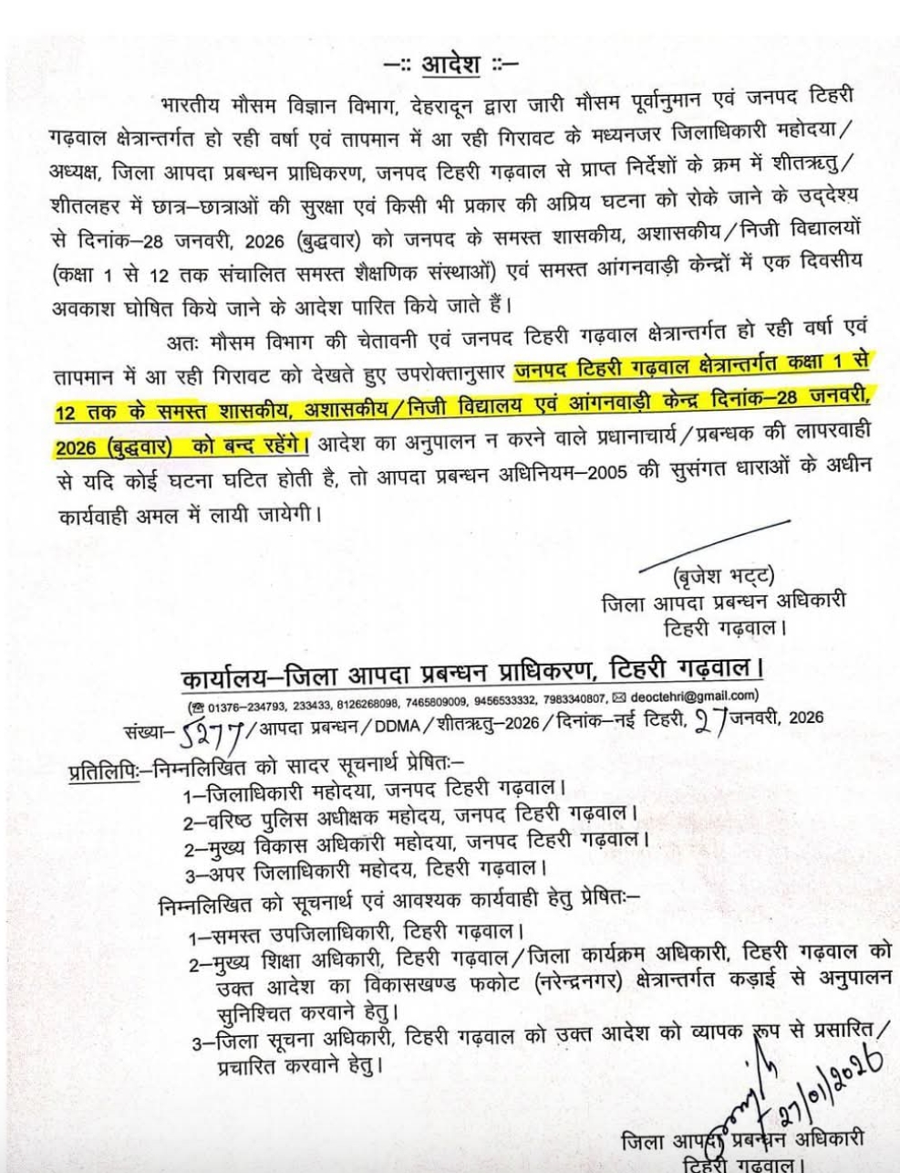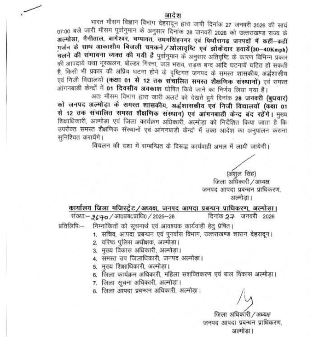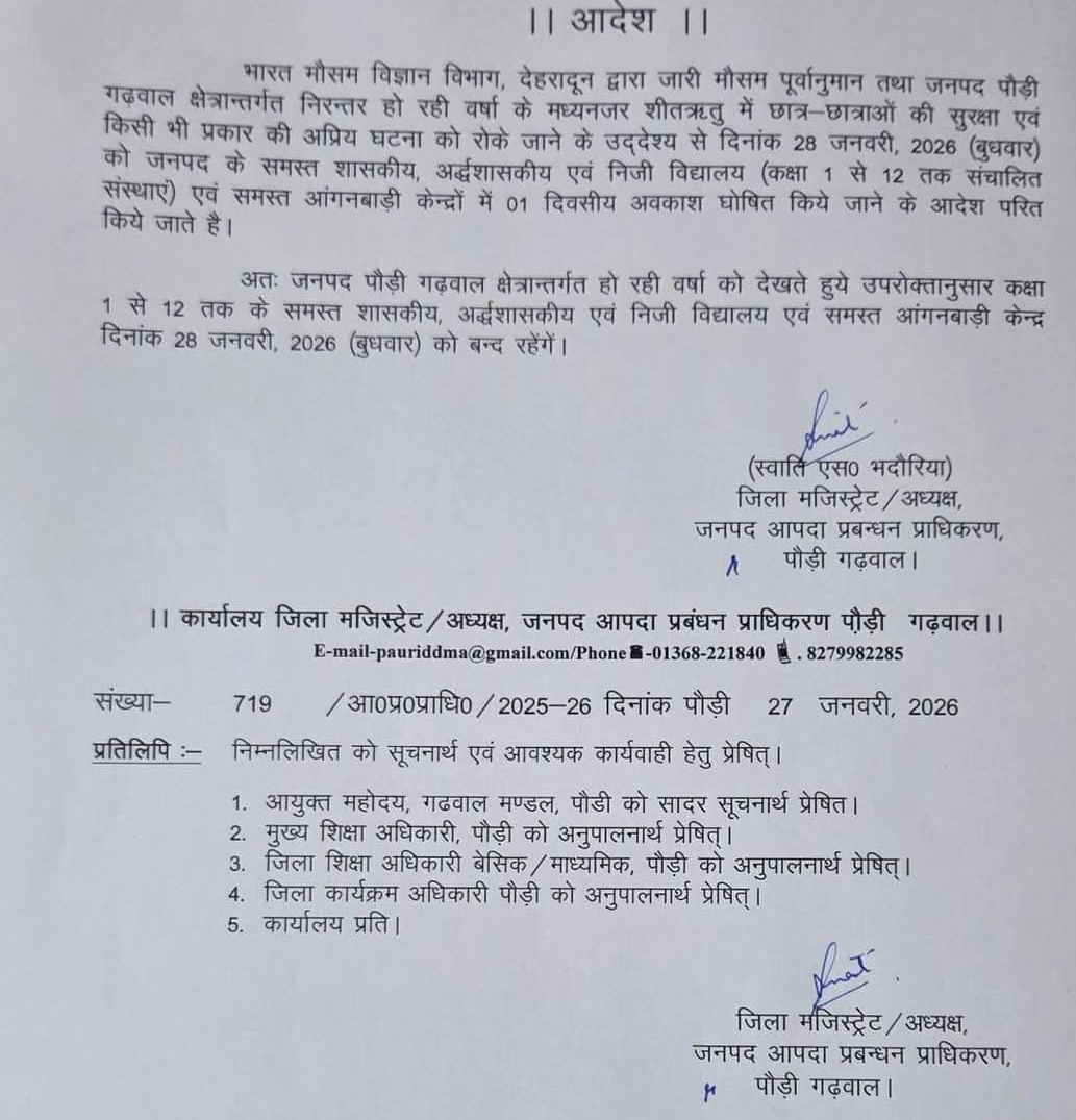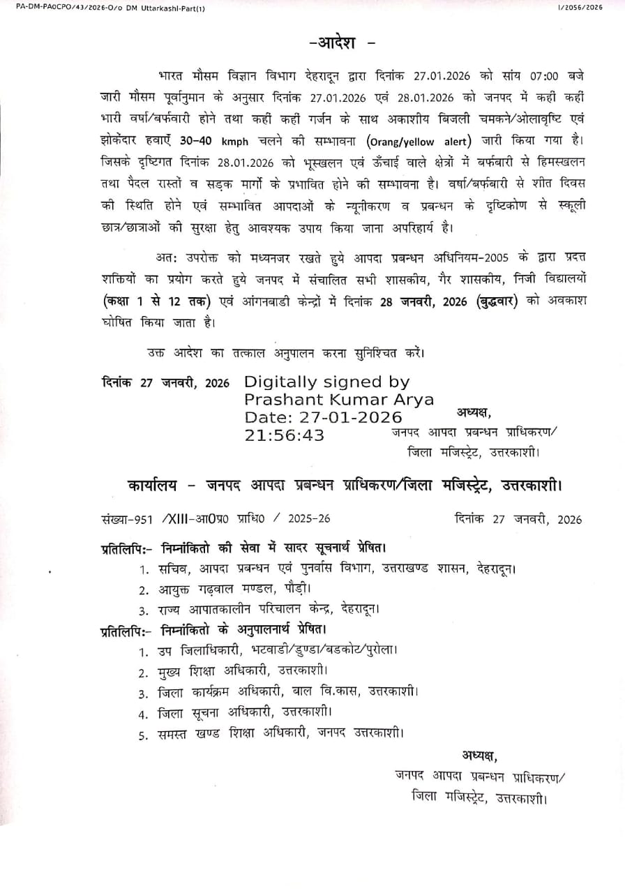 उत्तरकाशी जनपद के शासकीय व अशासकीय एवं आंगनबाड़ी केंद्रों में अवकाश रहेगा।