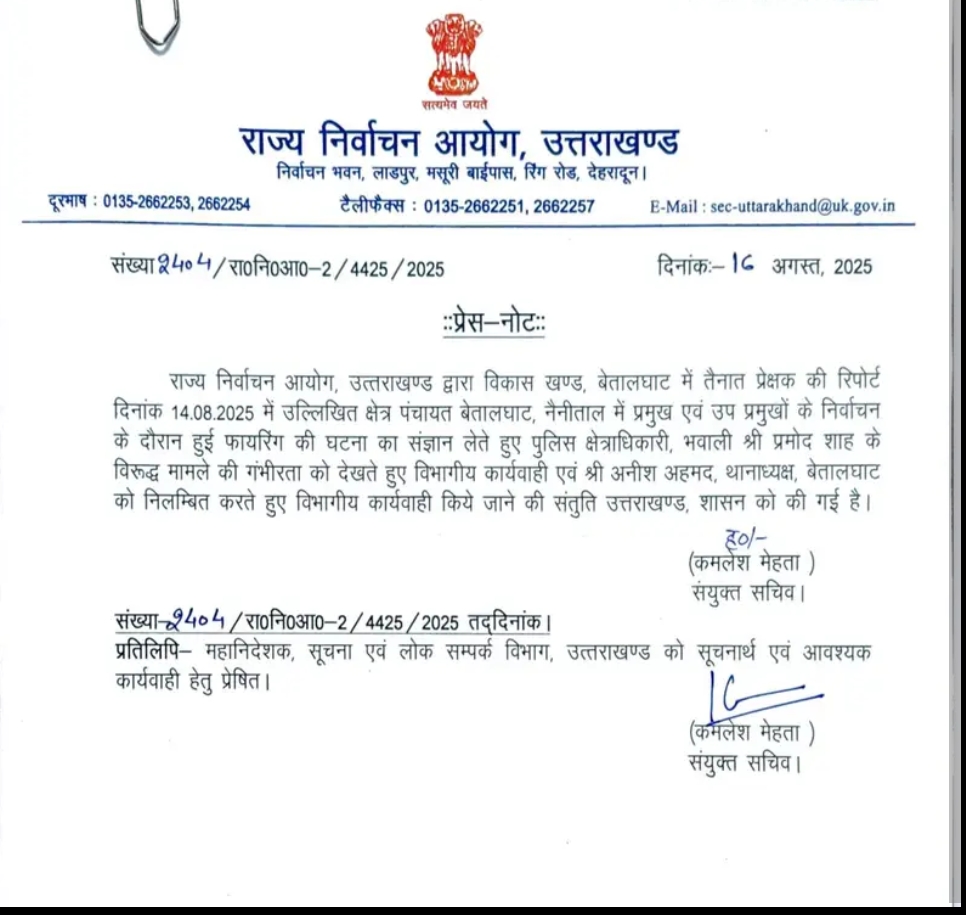 इस घटना का संज्ञान लेते हुए राज्य निर्वाचन आयोग ने सख्त रुख अपनाया है। आयोग की रिपोर्ट के आधार पर भवाली के पुलिस क्षेत्राधिकारी प्रमोद शाह के विरुद्ध विभागीय कार्रवाई की संस्तुति शासन को भेजी गई है, वहीं बेतालघाट थानाध्यक्ष अनीश अहमद को तत्काल प्रभाव से निलंबित कर विभागीय जांच का आदेश दिया गया है।
