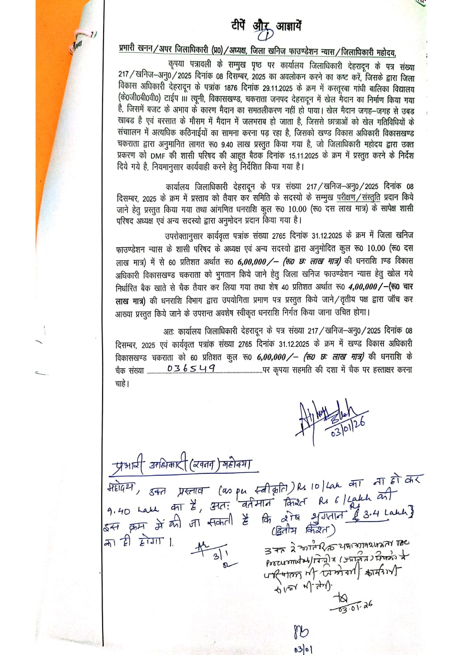 खण्ड विकास अधिकारी, विकासखण्ड चकराता द्वारा खेल मैदान के समतलीकरण हेतु रु० 9.40 लाख की अनुमानित लागत प्रस्तुत की गई, जिसे जिलाधिकारी के निर्देशानुसार जिला खनिज फाउंडेशन न्यास की शासी परिषद के समक्ष परीक्षण एवं संस्तुति हेतु प्रस्तुत किया गया।