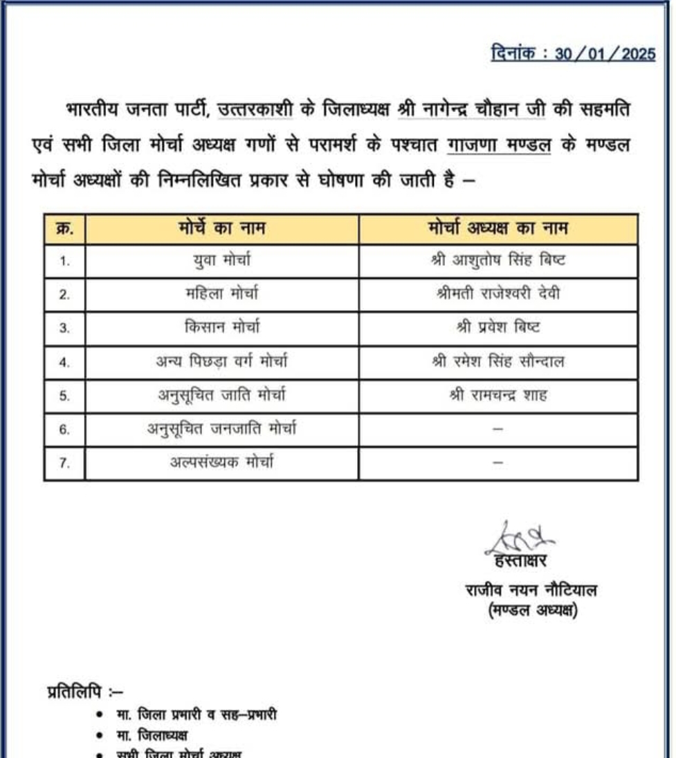 उत्तरकाशी – भारतीय जनता पार्टी के अध्यक्ष नागेन्द्र चौहान ने गाजणा मंडल के पदाधिकारियों की सूची जारी कर उन्हे पार्टी का दायित्व सौप दिया है ।
