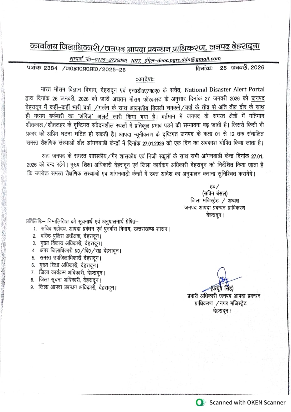 उत्तराखंड देहरादून में भारी बारिश होने का मौसम विभाग ने किया आरेंज आलर्ड घोषित,डीएम ने किया छुट्टी का आदेश जारी January 27, 2026January 27, 2026 Rakesh Raturi 61 Views देहरादून -राजधानी देहरादून में मौसम विभाग ने ऑरेंज आलर्ड घोषित करते हुए आपदा प्रबंधन ने कक्षा 1 से 12वीं तक निजी व सरकारी सभी स्कूलों व आंगनबाड़ी केंद्रों की छुट्टी का आदेश जारी किया है-