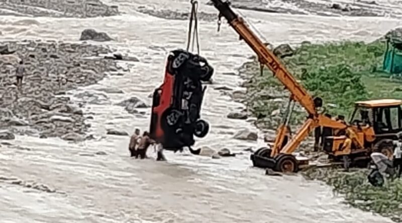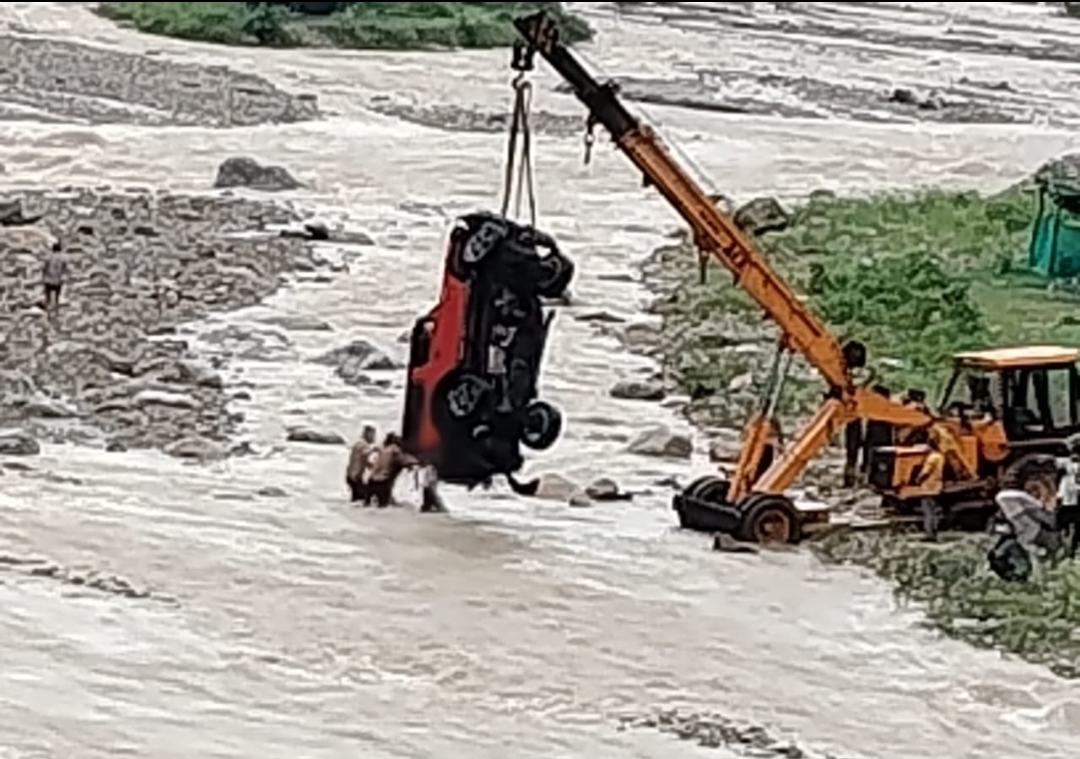 नदी के तेज बहाव के बीच फंसी थार कार को पुलिस ने JCB व क्रेन की सहायता से बाहर निकाल कर किया उसके मालिक के सुपुर्द