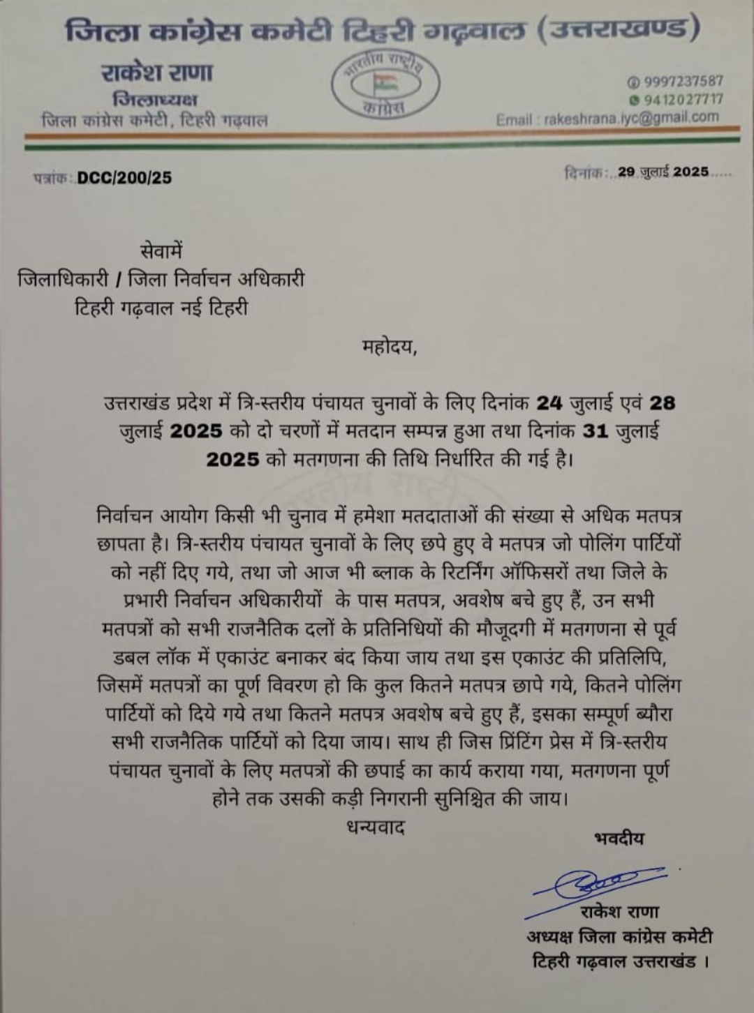 टिहरी – जिला कांग्रेस कमेटी टिहरी गढ़वाल के अध्यक्ष राकेश राणा ने जिलाधिकारी टिहरी को एक पत्र प्रेषित कर मतदान के बाद बचे हुए मत पत्रों को डबल लॉक में अकाउंट बनाकर रखे जाने की मांग की है।